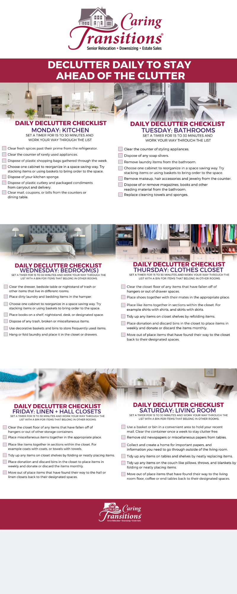 We created an infographic you can use to declutter in 15 minutes or less daily to keep your home clutter free for yourself and those you love.